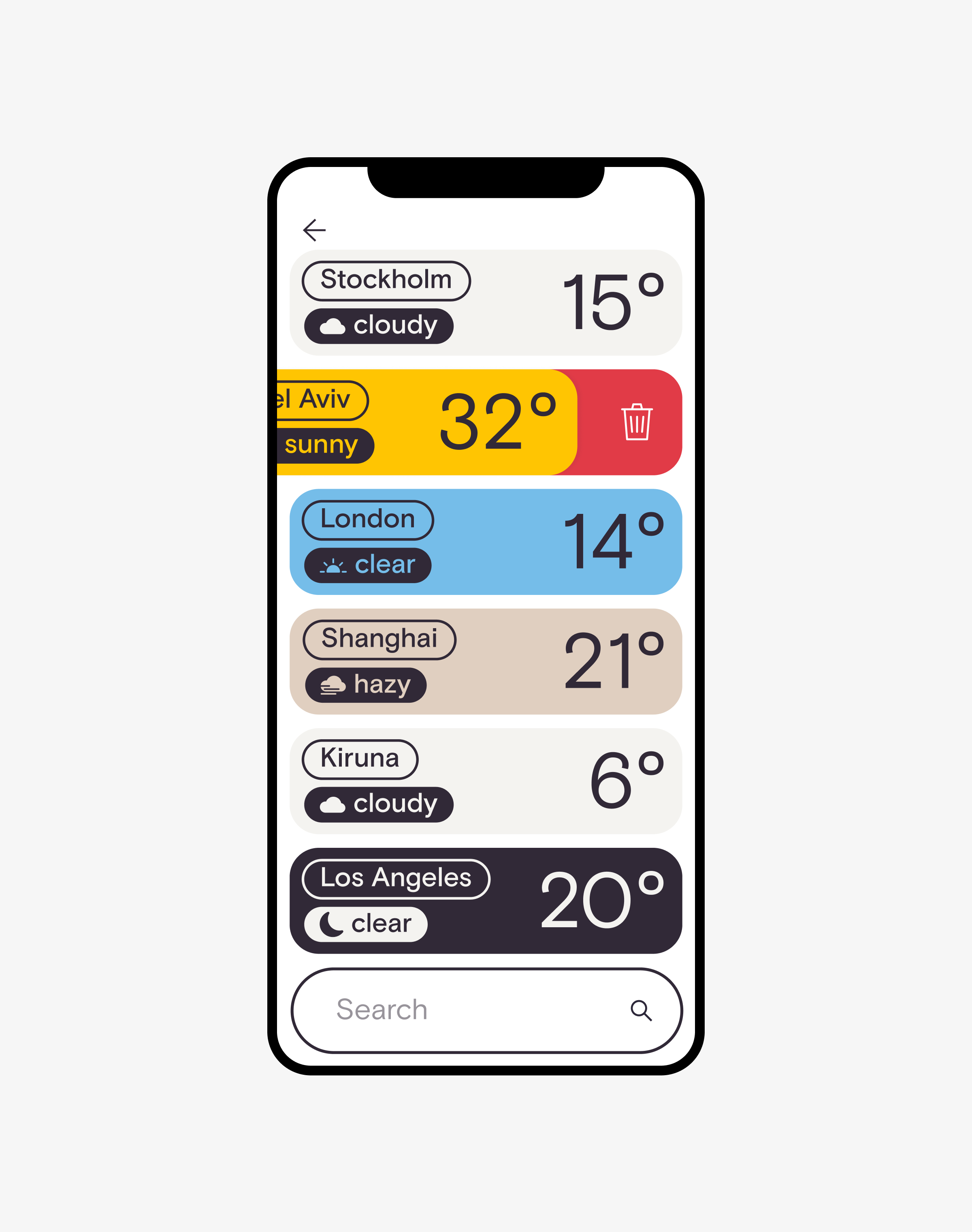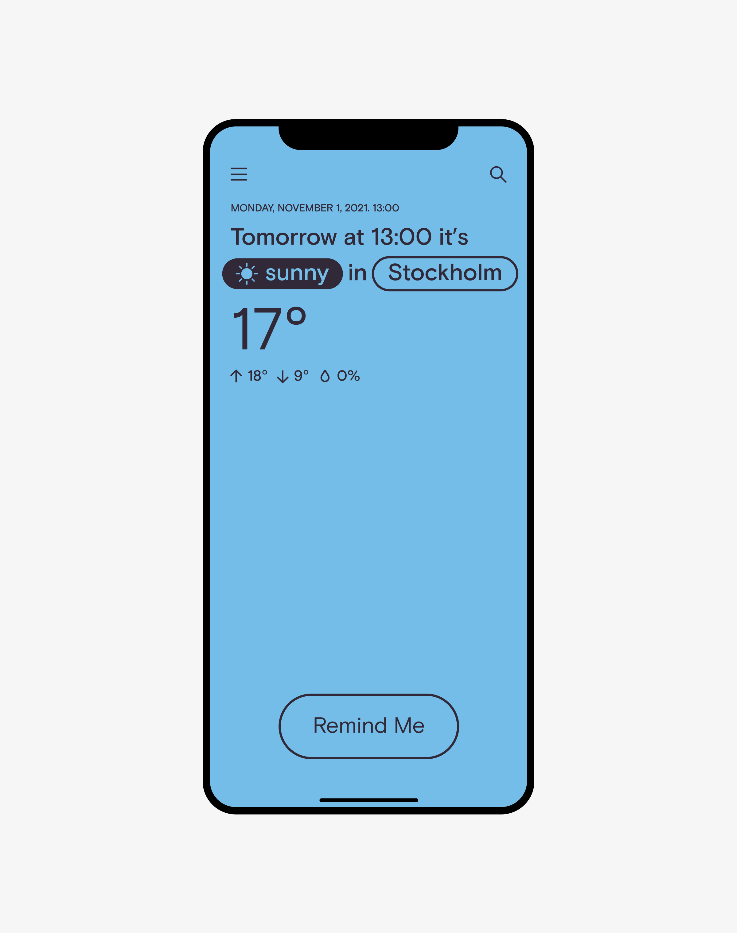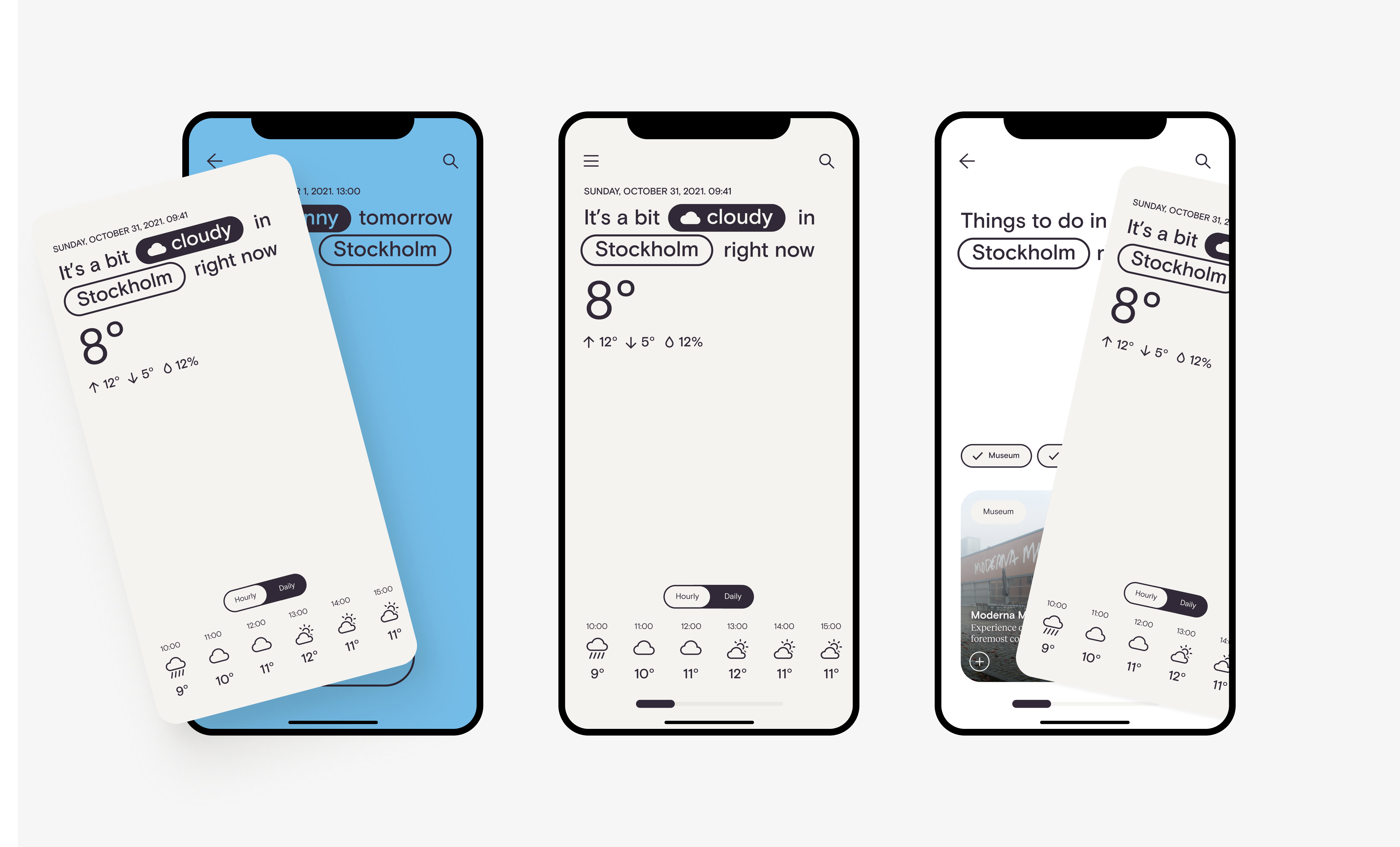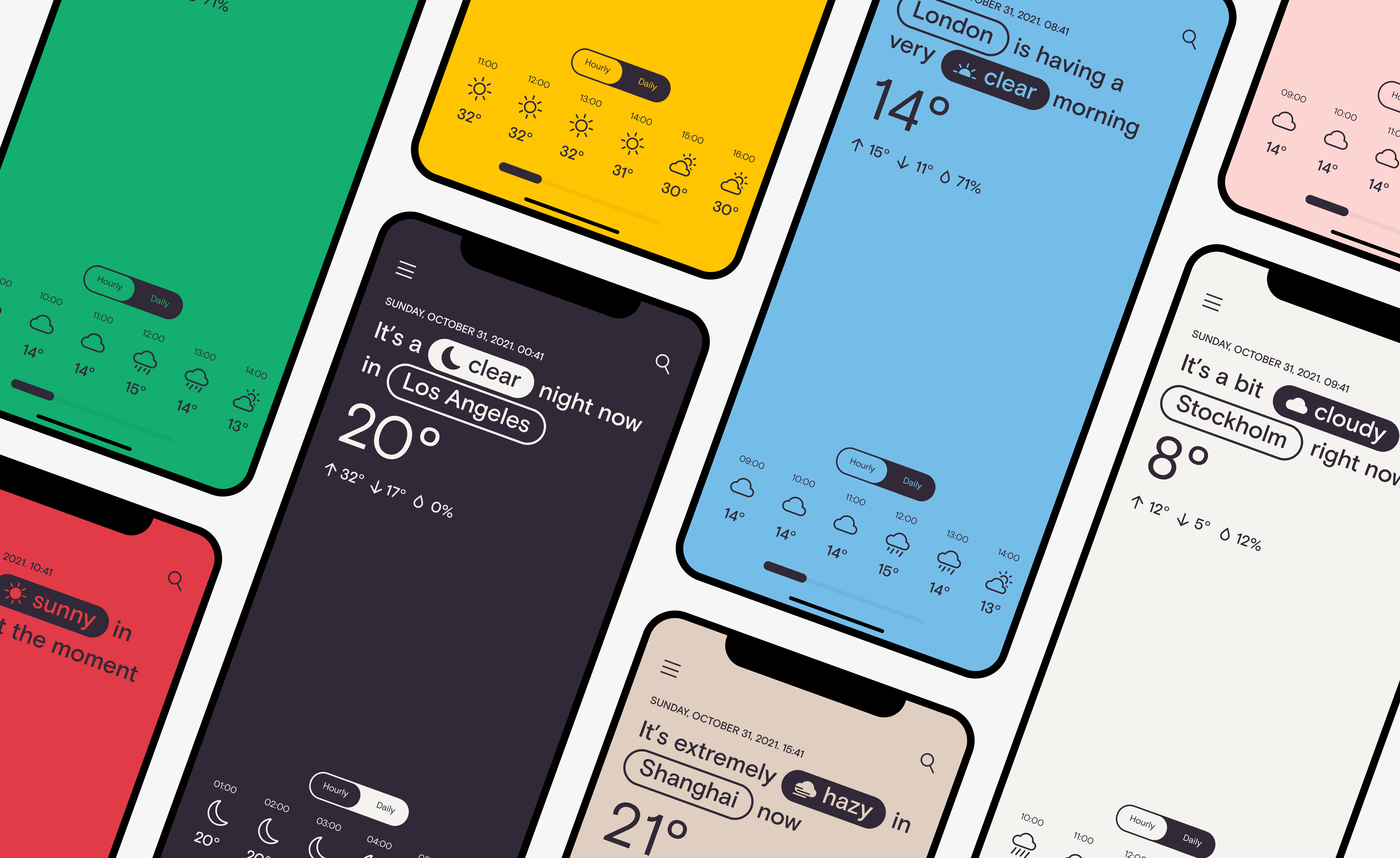 In order to display forecasts in a clear and focused way, the application was designed with a minimal approach that included clean typography, lots of white space and bright background colors.