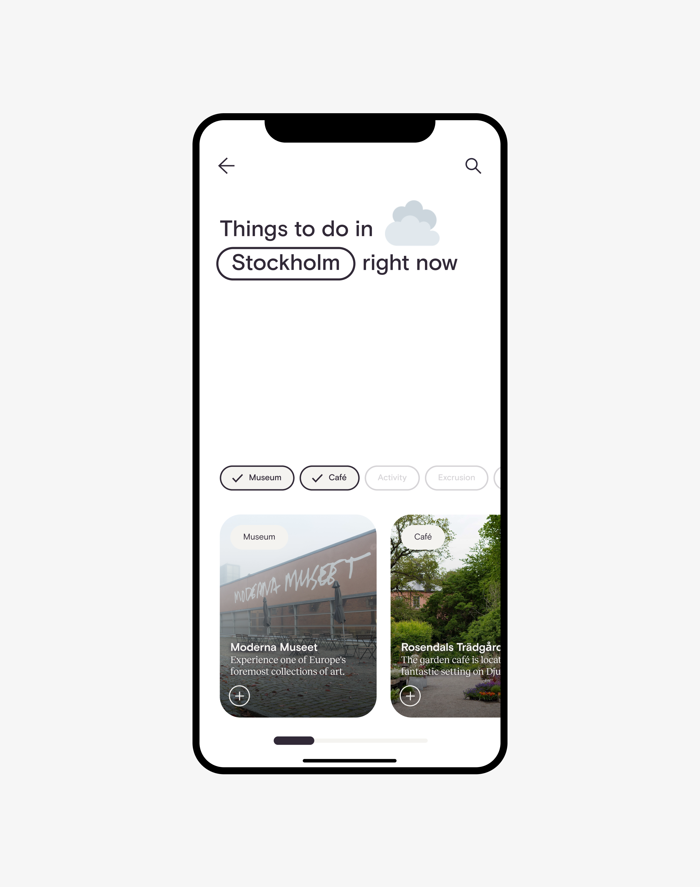 → Swipe right to see recommendations of what to do in the current weather.