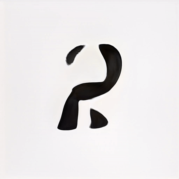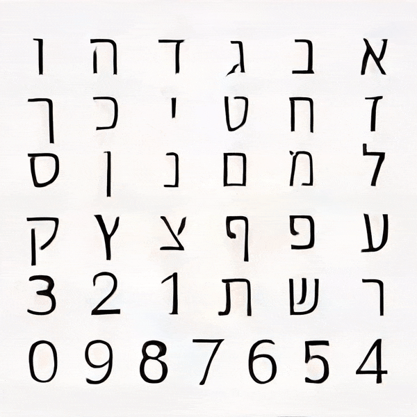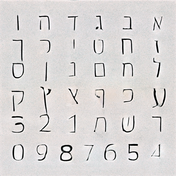 After many trials and experimentation, it was apparent that as the training continued, the results began resembling designed letterforms to the point where it was hard to distinguish the generated letterforms from the trained data. Some characters took more training steps to create recognisable forms, but generally speaking each glyph was processed to a stage where the image classification model could recognise it after 2000 Training steps. Some letters such as ע (ein), ש (shin) and צ (tsadik) took substantially longer time to train. Other less complex glyphs were generated pretty quickly. Letting the machine have the ability to select which typeform would represent each glyph generated inconsistency in the form of the typeface, ranging from simple non serif letters to serif ones, and everything in between. This alphabet came out very crude, a ransom-letter-resembling assemblage of letterforms that may not be considered a typeface, had it been created solely by a designer.