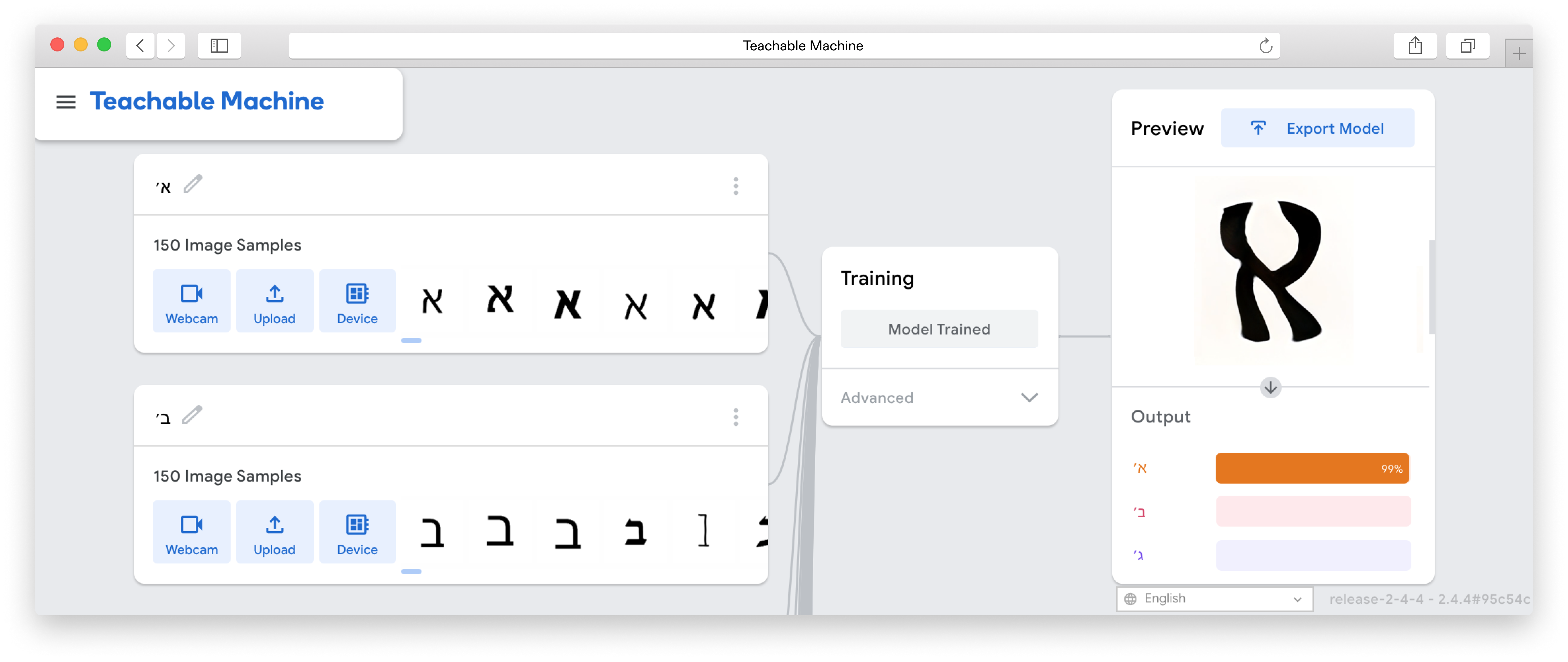First step in setting up the machine learning model was to create the dataset. This dataset was constructed of 150 glyphs per typeface (hebrew letters, latin upper and lowercase letters, numerals, punctuation, currency and math signs) of all available hebrew typefaces on Google Fonts, Adobe Fonts and other free fonts, organised as individual image-per-glyph dataset.