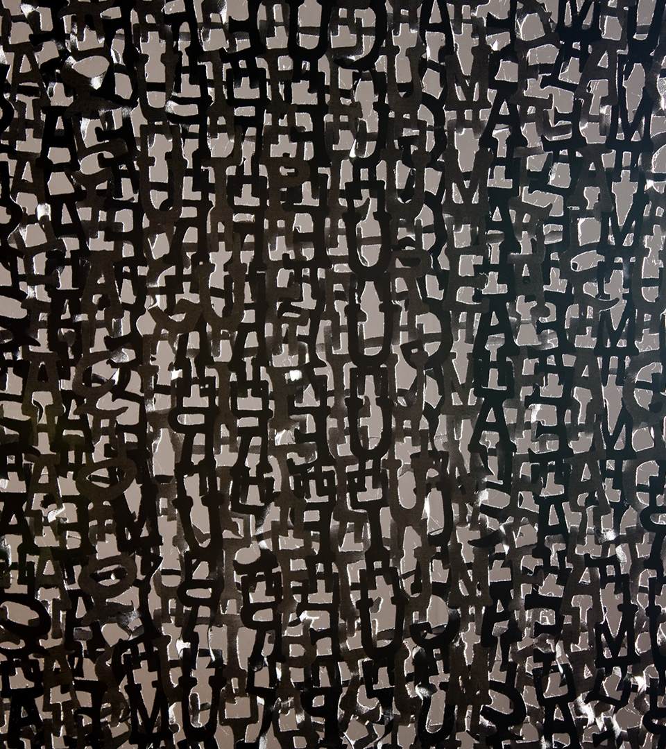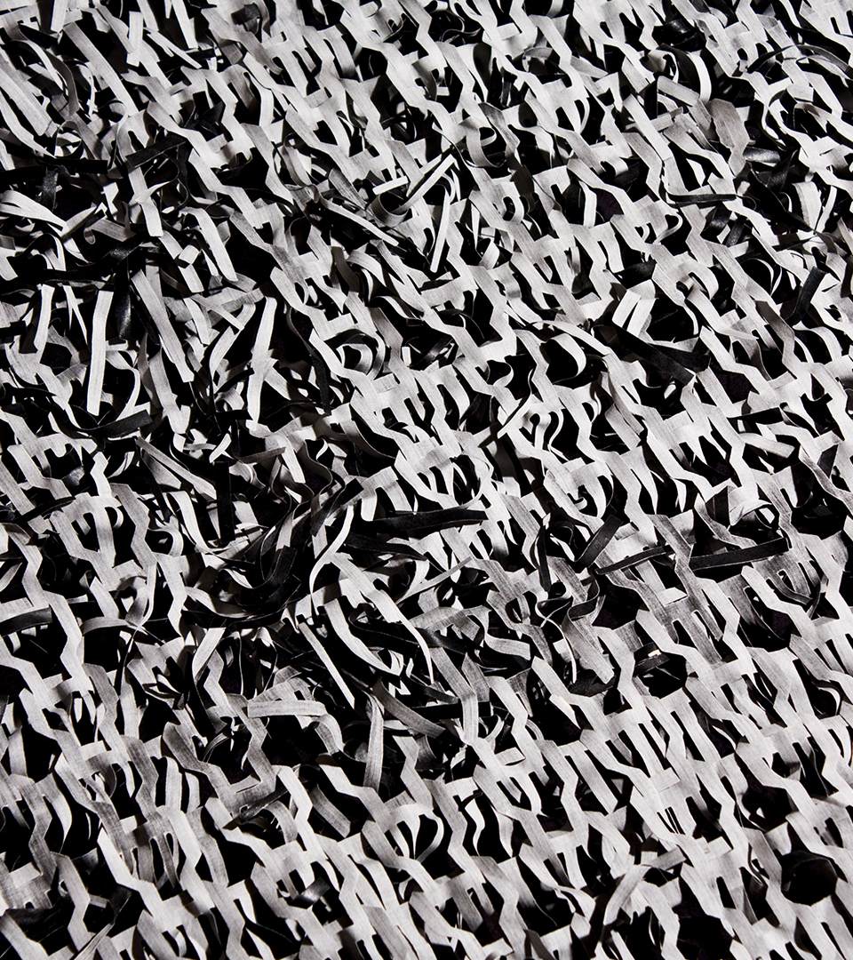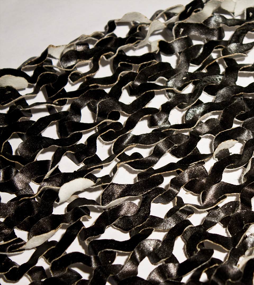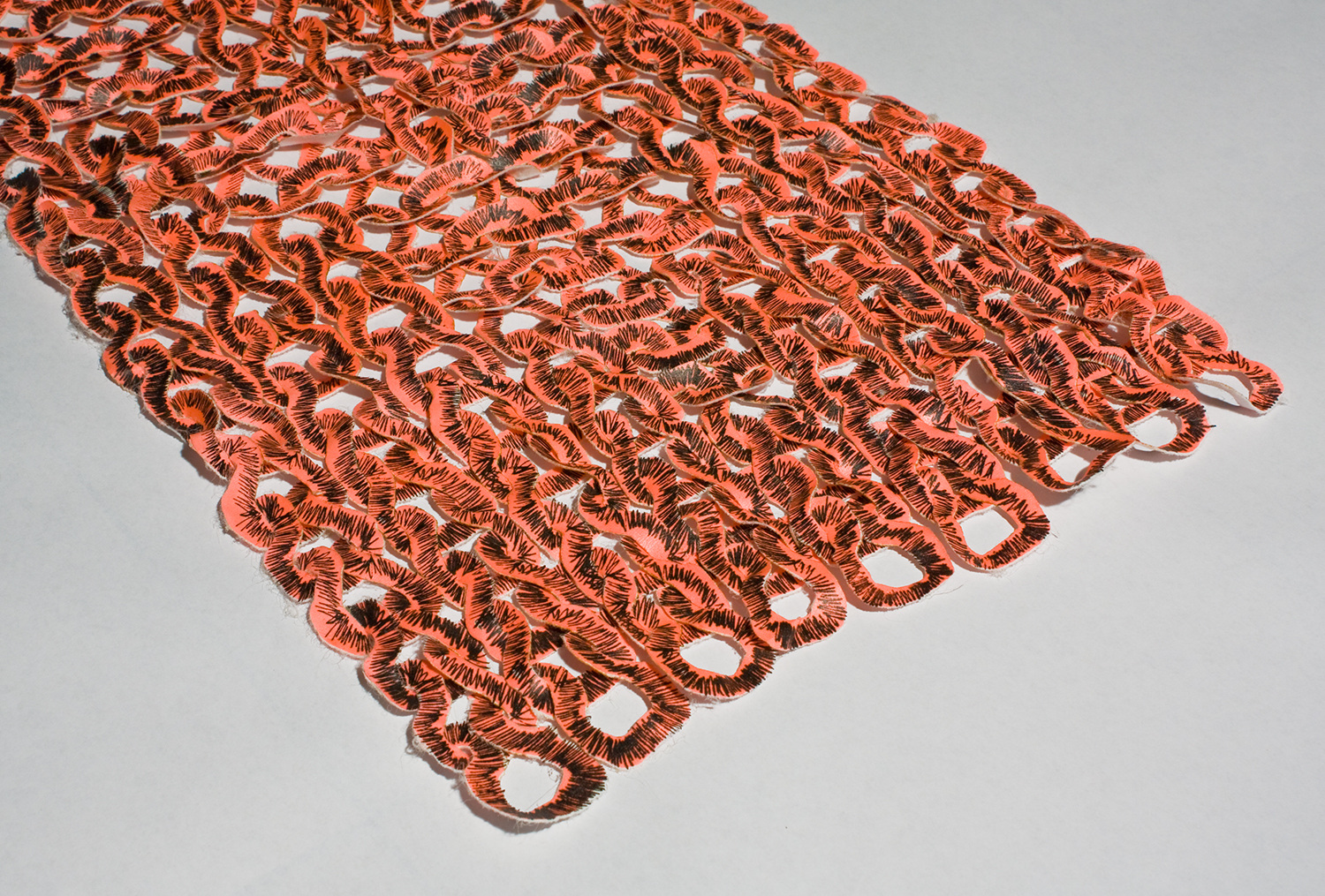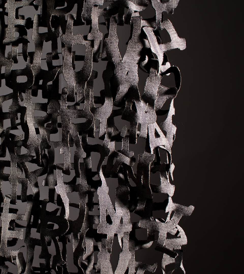 Looking at the semiotics (system of signs) of knitting. Identifying the single stitch as an identifier (the single unit, the font). Transforming the basic form of the unit, by recognizing the necessary parts of the stitch crucial for the forming of the knit and building new fonts for knitting. Building patterns (sentences) of knitting courses. Printing the patterns onto textiles, deconstructing the textiles into graphical patterns by the process of burning out the surface of the textiles, using the print as an obstruct. Reconstructing it back into a new surface by threading into a new surface, a new identified.
