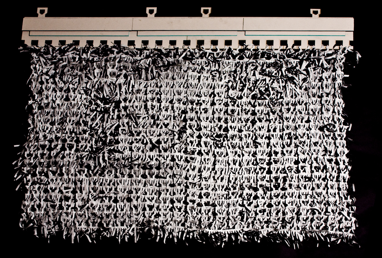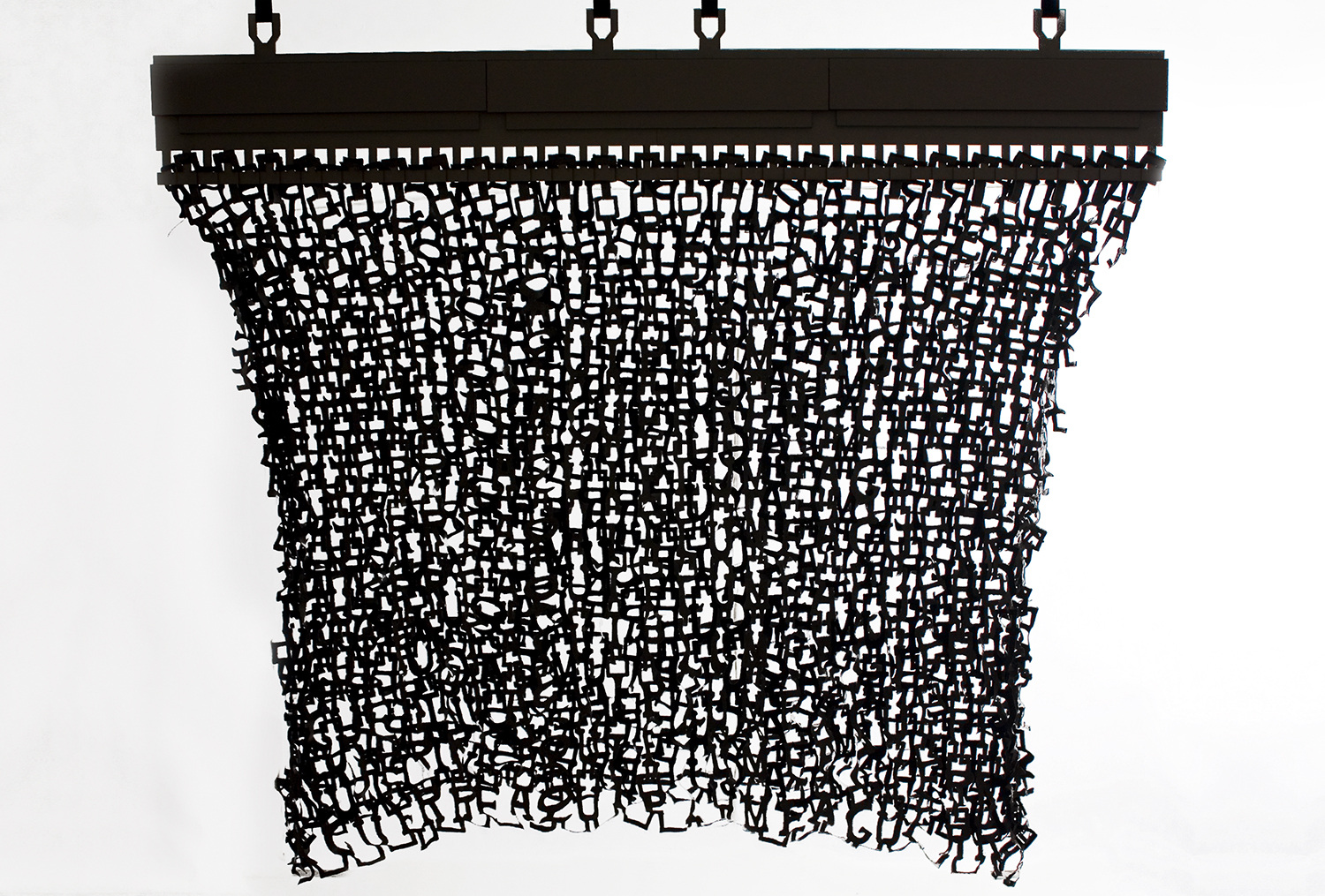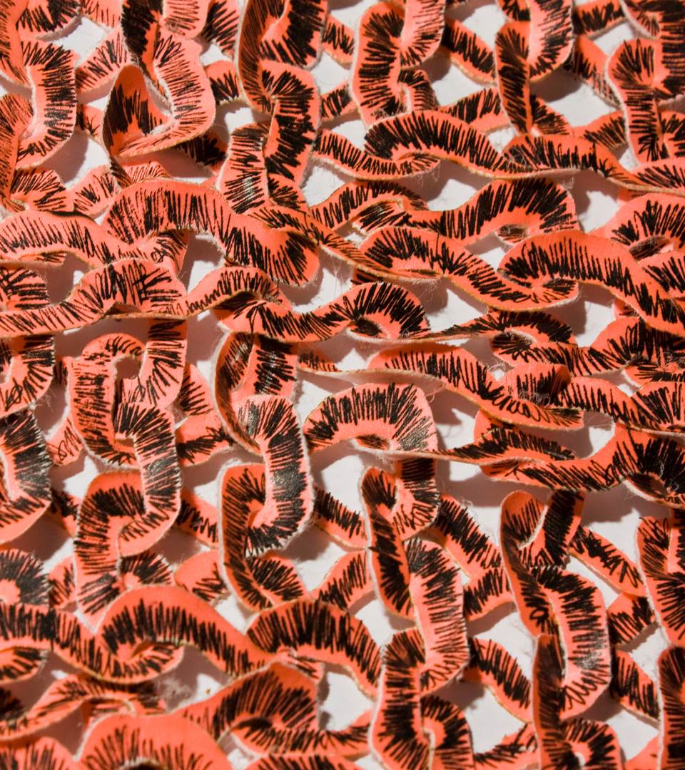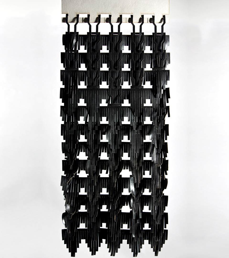 Looking at the semiotics (system of signs) of knitting. Identifying the single stitch as an identifier (the single unit, the font). Transforming the basic form of the unit, by recognizing the necessary parts of the stitch crucial for the forming of the knit and building new fonts for knitting. Building patterns (sentences) of knitting courses. Printing the patterns onto textiles, deconstructing the textiles into graphical patterns by the process of burning out the surface of the textiles, using the print as an obstruct. Reconstructing it back into a new surface by threading into a new surface, a new identified.