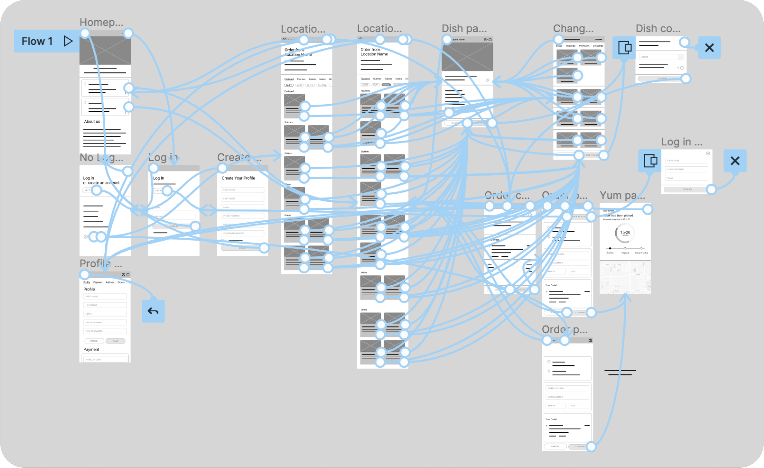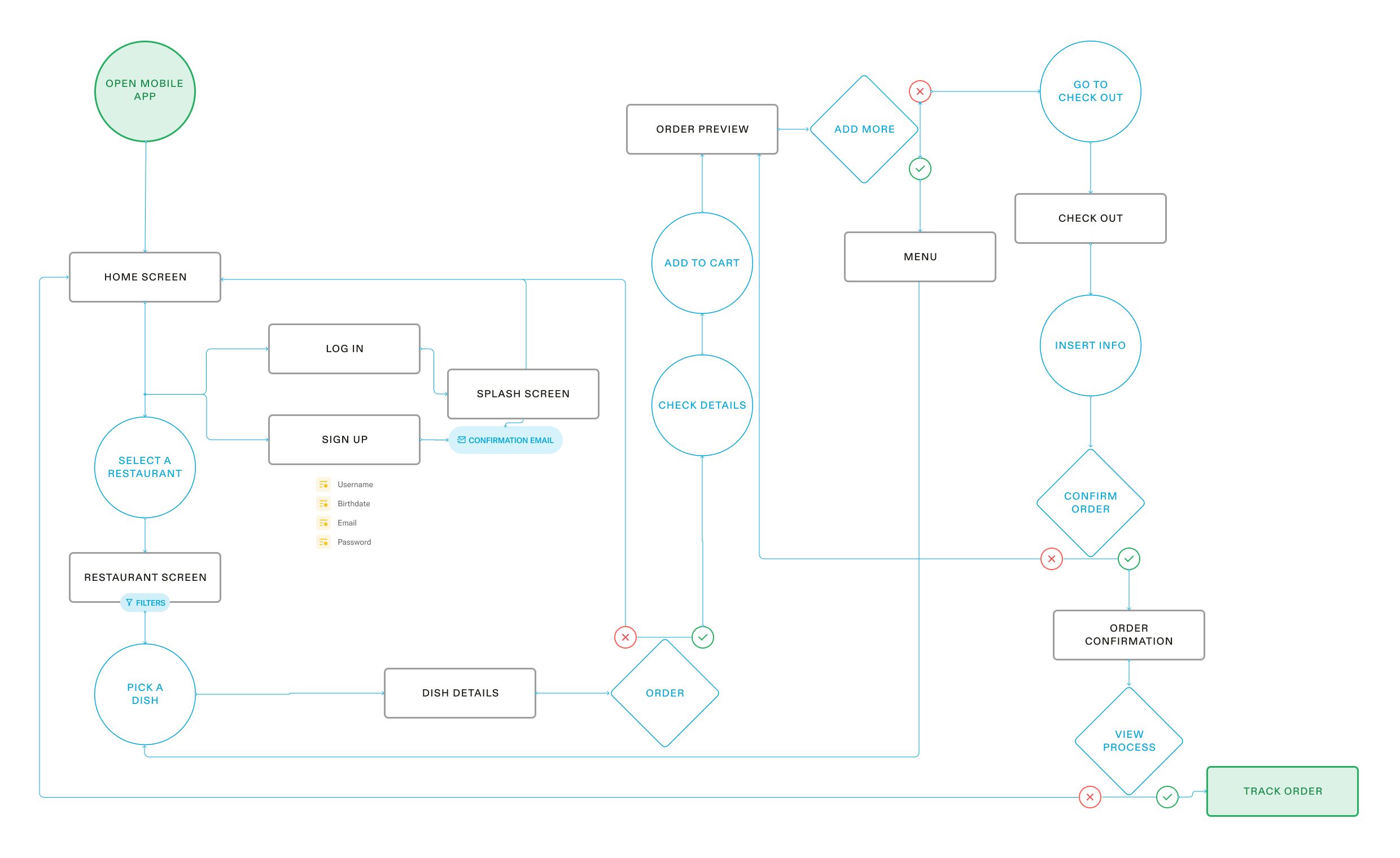 User flow is the path taken by our prototypical user Johanna on the app to complete a task. The user flow takes them from their entry point through a set of steps towards a successful outcome and final action, finalizing their order.