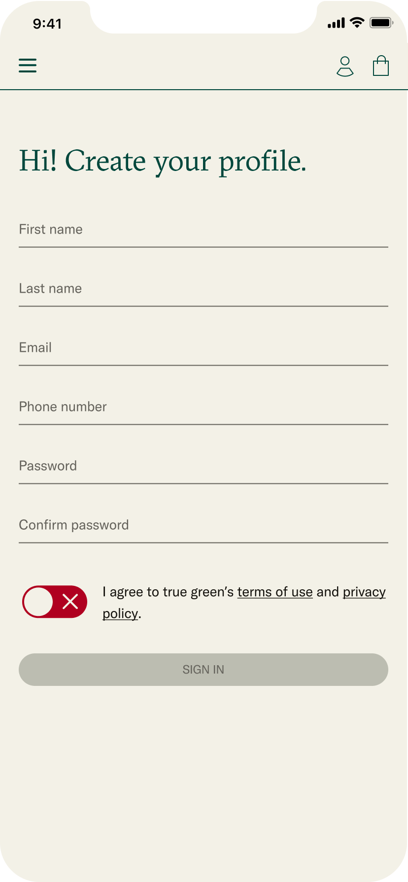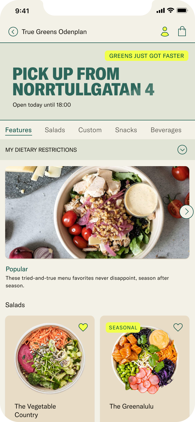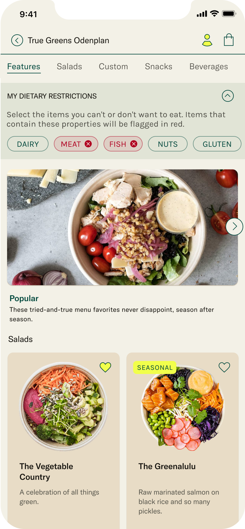 Design an app for True Greens, that allow users to easily pickup fresh, healthy orders, that suits their dietary restrictions.