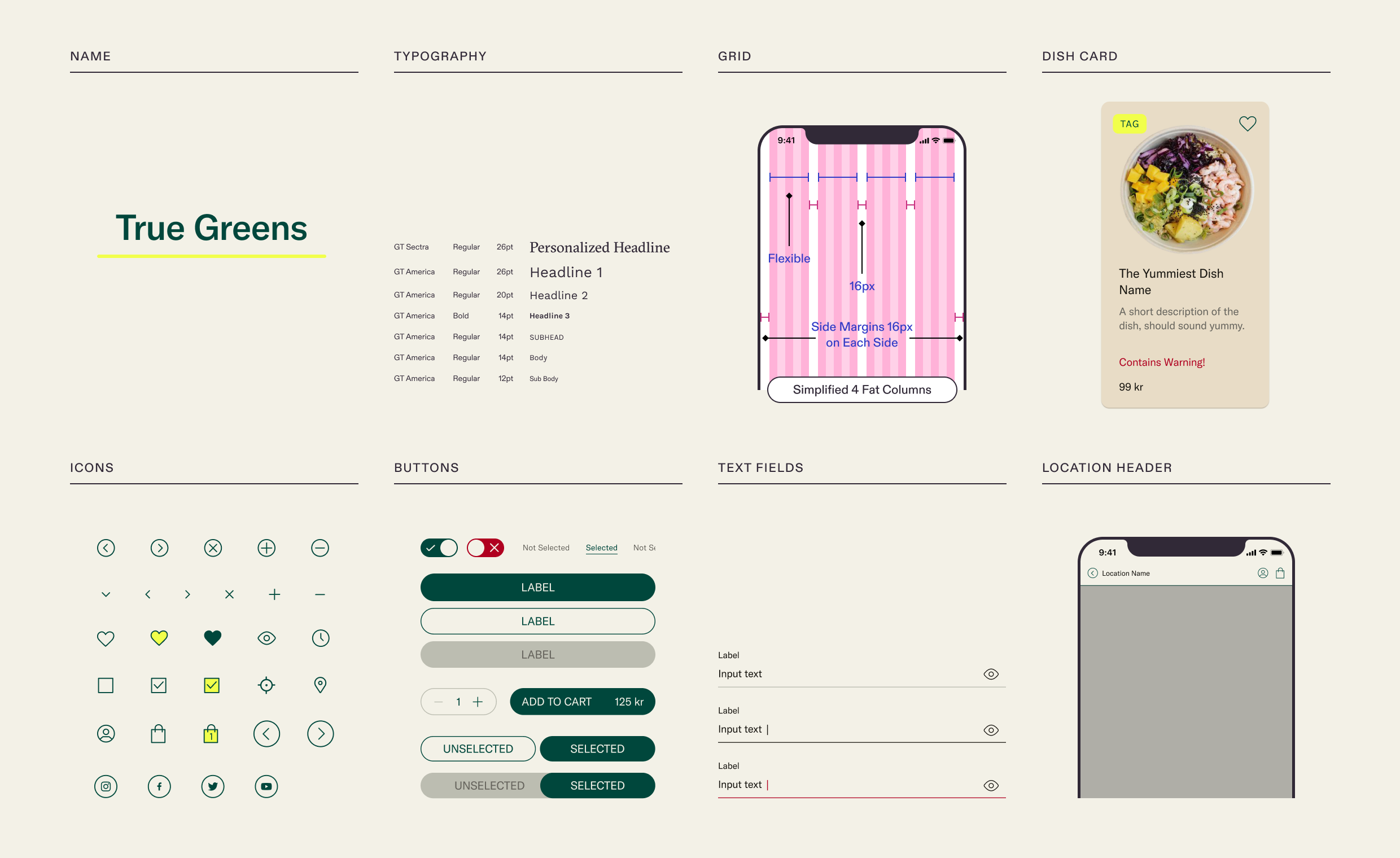A quick brand guide for True Greens was created. It included typography, color and sticker sheet which includes the elements that make up layouts, status bars, bottom toolbars, cards, different fields, buttons, and other components.